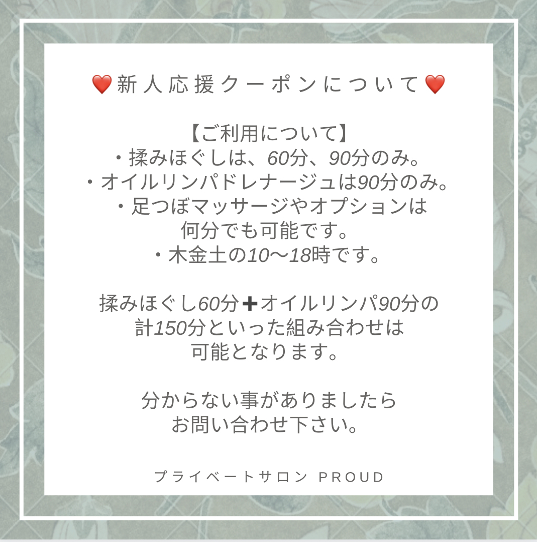 頑張る新人セラピスト育成のため、期間限定でキャンペーンを行います♡条件がありますので、よく読んで頂いた上でお問合せください。予約サイトからは、木土曜日の予約が出来ないようになっておりますので、必ずお問合せください。LINE公式アカウントを登録していただくとクーポンが使えますので、ぜひLINE登録をお願い致します♡こちらからお願いします♡お待ちしております♡✼••┈┈┈┈••✼••┈┈┈┈••✼••┈┈┈┈••✼詳しくはブログか予約フォームへ↓↓予約フォームは24時間受付可能♡☑︎ブログhttp://proud0401.blog.shinobi.jp/☑︎予約フォームhttps://reserva.be/relaxationsalonproud※ご予約は3日前まで可能です。☑︎Instagram@proud0401https://www.instagram.com/proud0401/ご不明、ご質問などございましたら各サイト内のメールかxxx.proud0401.xxx@gmail.comまで。お電話は0286111009までご連絡お待ちしております♡✼••┈┈┈┈••✼••┈┈┈┈••✼••┈┈┈┈••✼
