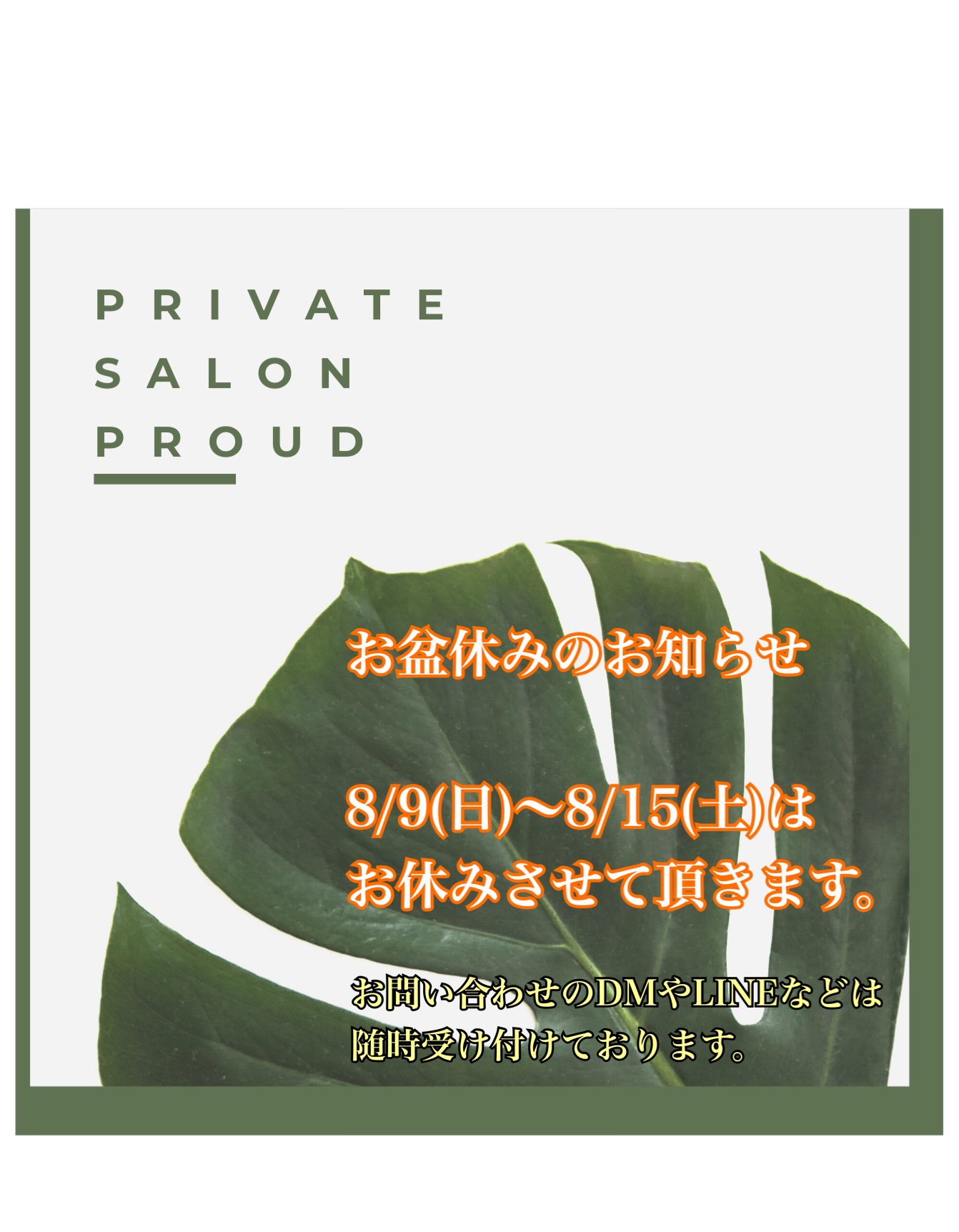 お盆休みのお知らせ8/9(日)~8/15(土)までお盆休みを頂く事になりました。コロナ問題で帰省の自粛を促されていますが、皆様もマスクと手洗いをこまめにして充分お気をつけて、行動されてくださいね。お問い合わせは随時受け付けております。✼••┈┈┈┈••✼••┈┈┈┈••✼••┈┈┈┈••✼詳しくはブログか予約フォームへ↓↓予約フォームは24時間受付可能♡☑︎ブログhttp://proud0401.blog.shinobi.jp/☑︎予約フォームhttps://reserva.be/relaxationsalonproud※ご予約は3日前まで可能です。☑︎Instagram@proud0401https://www.instagram.com/proud0401/ご不明、ご質問などございましたら各サイト内のメールかxxx.proud0401.xxx@gmail.comまで。お電話は0286111009までご連絡お待ちしております♡✼••┈┈┈┈••✼••┈┈┈┈••✼••┈┈┈┈••✼